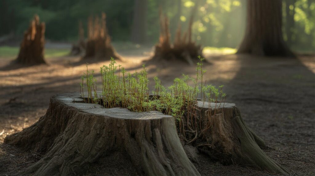 Stump regrowth happens when a cut tree uses its stored energy to send up new shoots. Dormant buds hidden in the stump or roots activate, producing stump sprouts or root suckers. These shoots rely on carbohydrates stored in the root system, allowing quick growth after cutting.