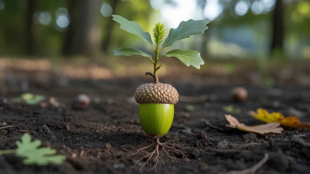 Germination timing depends on the oak species. White oak acorns often sprout soon after fall planting, while red oak acorns emerge in spring after stratification. During this stage, seedlings need steady moisture and protection from pests.