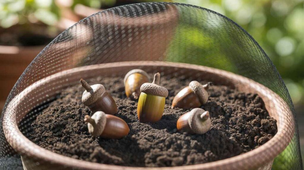 Covering the planting area with mesh helps protect acorns from squirrels and deer. Whether in containers or the ground, giving acorns the right depth, protection, and consistent care greatly increases the chance that each one will sprout into a sapling.