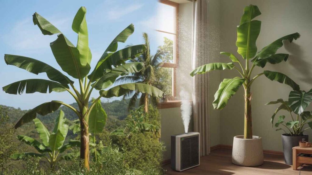 Banana trees need 6–8 hours of direct sunlight daily. They prefer warm temperatures (75–95°F / 24–35°C) and stop growing below 55°F (13°C). High humidity (50–70%) supports healthy leaves, especially indoors. In dry areas, misting or a humidifier prevents browning. Light, warmth, and humidity together create the tropical conditions banana trees need to thrive.