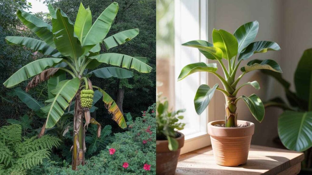 A realistic educational scene showing banana trees for beginners: a tropical outdoor tree with large green leaves and hanging fruit, and a dwarf indoor banana tree in a container near a sunny window, with a gardener watering or tending the plants.