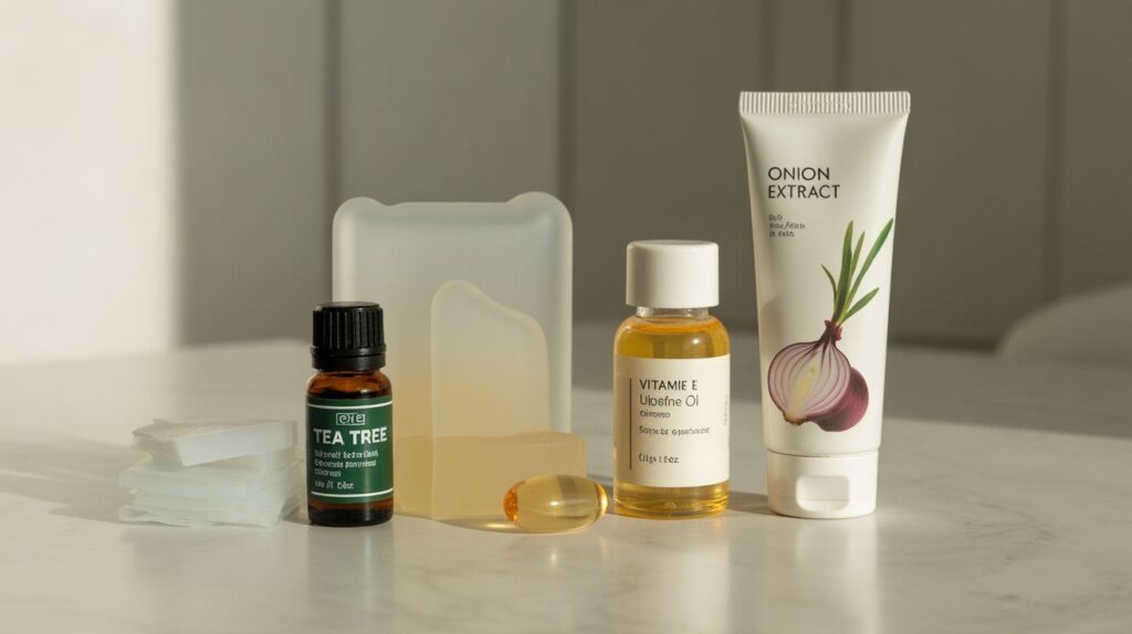 If tea tree oil alone isn’t enough, several alternatives can help manage keloid scars. Silicone gel sheets and topical gels are clinically proven to flatten and soften keloids. Onion extract offers anti-inflammatory benefits, while vitamin E supports skin elasticity and overall scar healing.