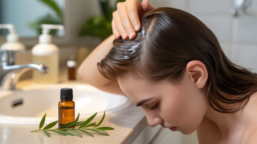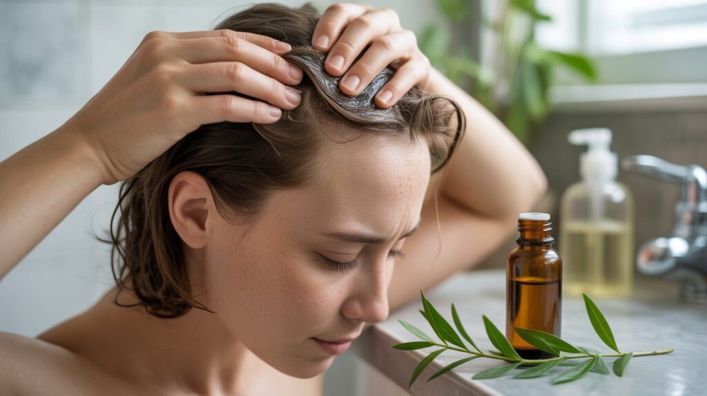 "Photorealistic image of a person applying tea tree oil to their scalp with a small amber bottle and fresh tea tree leaves nearby, representing natural hair care and scalp treatment."